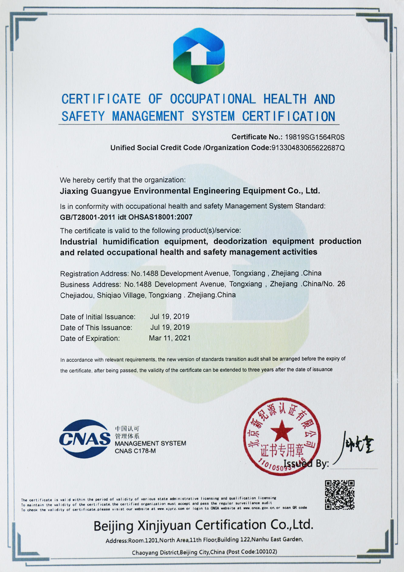 通過了ISO9001、ISO14001、OHSAS18001、AAA和CE等管理體系的認證